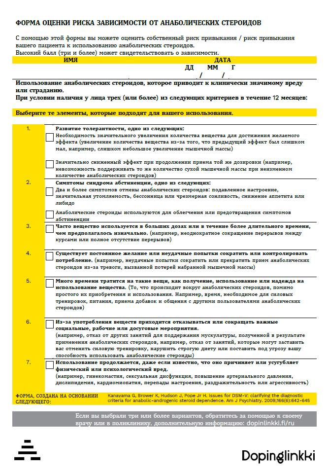 Иллюстрация: Загрузите форму оценки риска зависимости от анаболических стероидов в формате PDF, нажав на изображение. Форма позволяет оценить собственный риск привыкания / риск привыкания вашего пациента от употребления анаболических стероидов и риск развития зависимости.