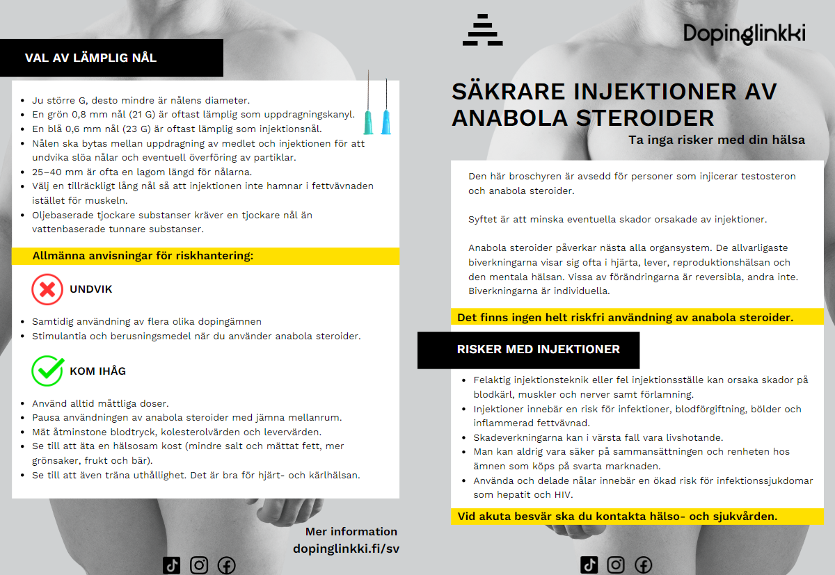 Den här informationsbroschyren är avsedd för personer som injicerar testosteron och anabola steroider och för hälso- och sjukvårdspersonal som arbetar med dessa personer. Syftet med broschyren är att minska eventuella skador orsakade av injektioner. Om du trots möjliga biverkningar och risker har bestämt dig för att börja injicera anabola steroider, hjälper den här broschyren dig att göra det så säkert som möjligt.